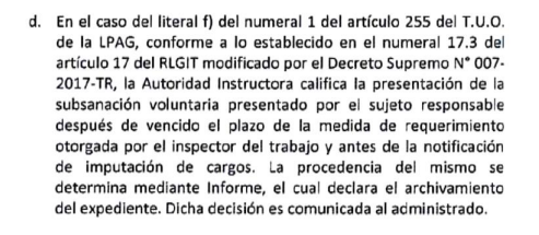 Esto es reconocido por el Reglamento de la Ley General de Inspección de Trabajo en el artículo 47-A del RLGIT y la sección 7.1.2.7 (Procedencia de Eximentes) de la Directiva N° 001-2017-SUNAFIL/INII – “Directiva que regula el Procedimiento Sancionador del Sistema de Inspección del Trabajo”, en cuyo literal a) señala que constituyen eximentes de responsabilidad por la comisión de infracciones las condiciones previstas en los literales a, b, c, d, e y f del numeral 1 del artículo 255 del TUO de la LPAG (actual artículo 257 del texto vigente), y posteriormente señala que: