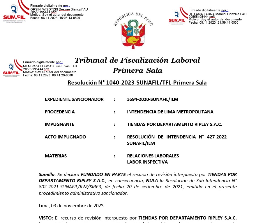 Mediante Resolución N° 1040-2023-SUNAFIL/TFL-Primera Sala, El Tribunal de Fiscalización Laboral declaró fundado en parte el recurso de revisión interpuesto por TIENDAS POR DEPARTAMENTO RIPLEY S.A.C., contra la Resolución de Intendencia N° 427-2022-SUNAFIL/ILM, de fecha 8 de marzo de 2022, interpuesto contra la imposición de sanción de Multa de S/. 19350.00 por la comisión de dos infracciones muy graves.